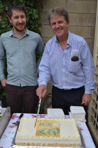 Phil and illustrator Owen Swan cutting the cake the launch of ANZAC Biscuits.